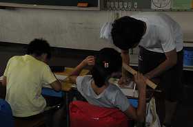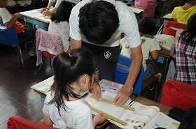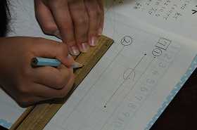 決められた長さを定規ではかり、正確に線に書いています。