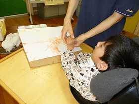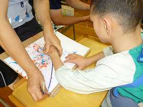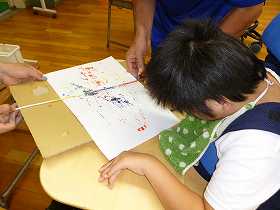 糸に色を付け、紙の上で。はじいて模様を付けています。