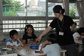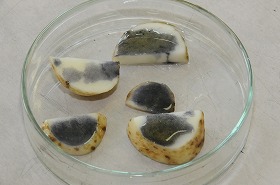 ジャガイモにでんぷんが含まれているかどうかをヨウ素液を使って調べています。