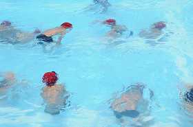 真夏の太陽の下で、子どもたちが水慣れの運動をしています。