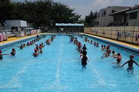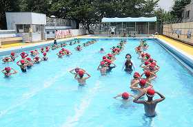 真夏の太陽の下で、子どもたちが水慣れの運動をしています。