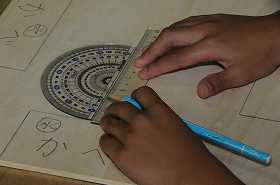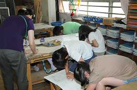 「油面住宅」をテーマに、のこぎりの使い方に気をつけながら家の部品を作っています。