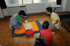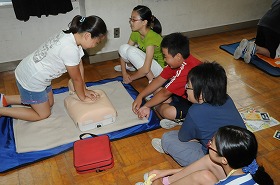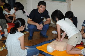 消防署員の指導を受けながら、6年生が交代で心肺蘇生の訓練を受けています。