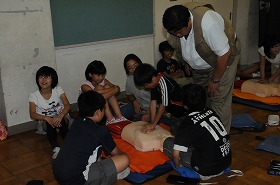 消防署員の指導を受けながら、6年生が交代で心肺蘇生の訓練を受けています。