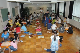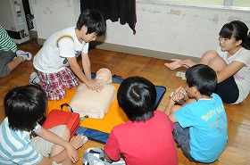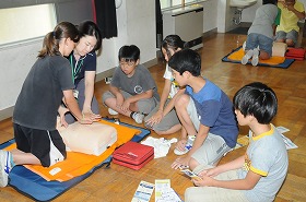 消防署員の指導を受けながら、6年生が交代で心肺蘇生の訓練を受けています。
