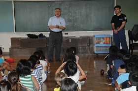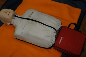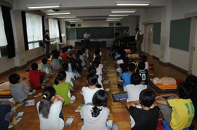 消防署員の指導を受けながら、6年生が交代で心肺蘇生の訓練を受けています。