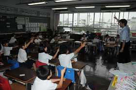 それぞれの文房具のカードを見て、英語の言い方を練習した後、「あなたは○○を持っていますか」を英語で言っています。