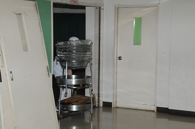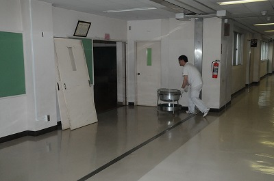 夏休みに給食室の床改修工事が行われます。そのために、給食室の物品を移動しています。