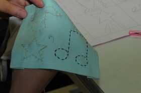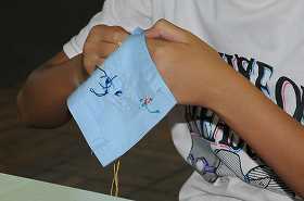 針と糸を使って、文字やデザインを表現しています。