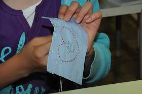 針と糸を使って、文字やデザインを表現しています。