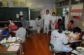 前期前半の給食最後の日です。いつも給食を作ってくれている藤江の調理員さんが、わかたけの子どもたちの顔を見に来てくれました。