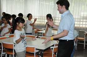 集まった子どもたちが英語の歌を歌いながら挨拶をしています。