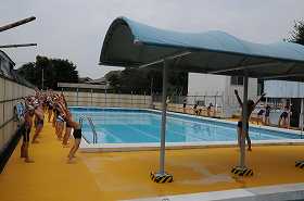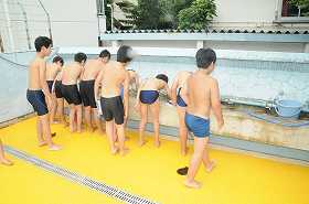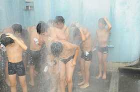 バディーによる人数確認の後で、準備運動、給水、シャワーを行っています。