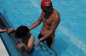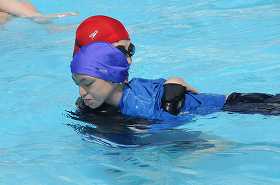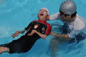 3日目にようやく夏の日差しになり、わかたけ学級の子どもたちがプールに入ることができました。個別に水治訓練をしています。