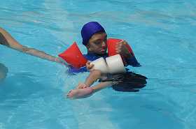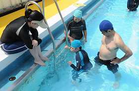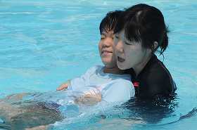 3日目にようやく夏の日差しになり、わかたけ学級の子どもたちがプールに入ることができました。個別に水治訓練をしています。