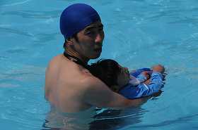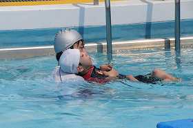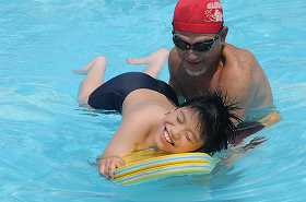 3日目にようやく夏の日差しになり、わかたけ学級の子どもたちがプールに入ることができました。個別に水治訓練をしています。