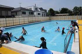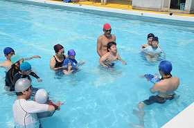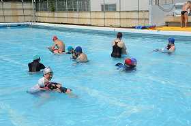 3日目にようやく夏の日差しになり、わかたけ学級の子どもたちがプールに入ることができました。みんなで集まり、はじめのあいさつをした後で、個別に水慣れをしています。