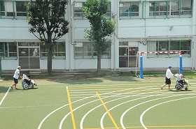 3日目にようやく夏の日差しになり、わかたけ学級の子どもたちがプールに入ることができます。みんなでプールに向かっています。