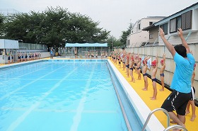 今日の3回目は低学年です。気温も水温も上がり、プールに入るには最適です。バディーによる人数確認の後、準備運動をしています。