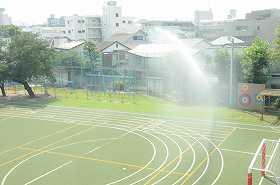 校庭の温度を下げるために、水をまいています。