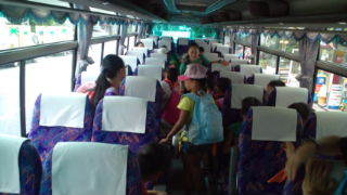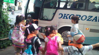 目黒通りからバスに乗りました。キャンプ場に向かって出発です。7:50