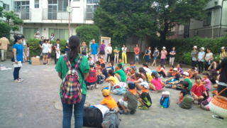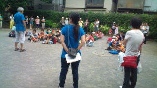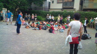 子どもたちが集合し、住区センターの裏の公園で出発式をしています。7:10