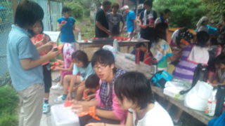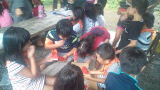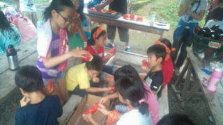 清東園キャンプ場にいます。子どもたちがおやつのスイカを食べています。15:45
