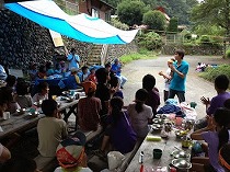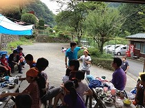 清東園キャンプ場にいます。昼食を食べ方をリーダーのお兄さんの話を聞いています。