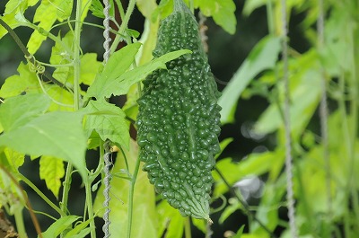 緑のカーテンに大きなゴーヤの実が付いています。