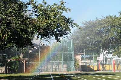スプリンクラーで散水している横に、きれいな虹が現れました。