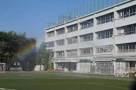 今日から前期の後半が始まります。子どもたちの登校を前に、校庭に散水したところ、きれいな虹が現れました。