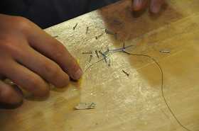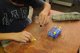 コイルに電気を通すと電磁石になるかどうかを実験しています。