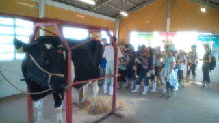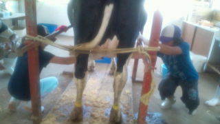 八ヶ岳牧場にいます。1組は搾乳体験を始めました。男の子はおっかなびっくりです。10:35