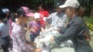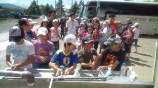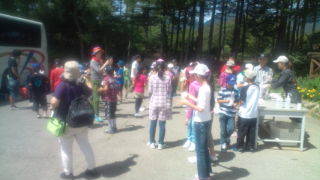 八ヶ岳牧場にいます。2組はバター作り体験から始まります。ペットボトルに牛乳を入れていただき、一生懸命振っています。日差しは強いですが、風は涼しくさわやかです。10:35