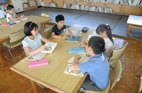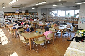 図書室で、友だちにすすめる本を書いています。