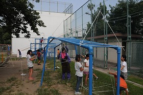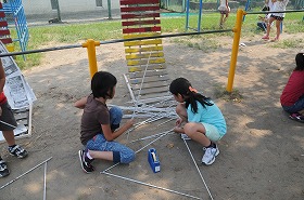細く丸めた新聞を使い、校庭でオブジェを作っています。