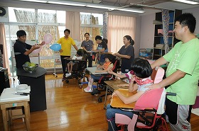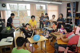 スイカ割りの代わりに風船を割っています。