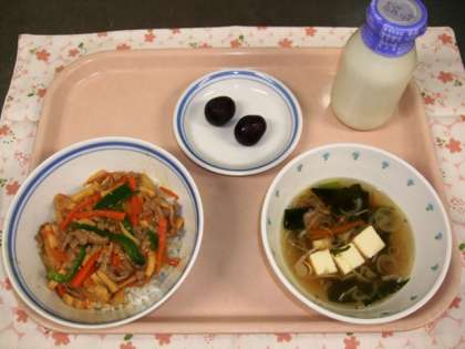 今日の給食は、高野豆腐のチンジャオロース丼・豆腐とわかめのスープ・果物(巨峰)・牛乳でした。
