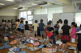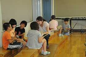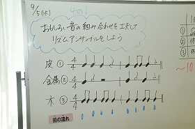 示された楽譜を見て、グループごとにリズム打ちの練習をしています。