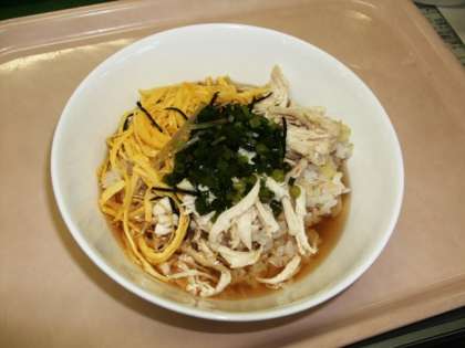 鶏飯は鹿児島県奄美大島の郷土料理です。ご飯の上に鶏肉・錦糸卵・たくあんの乗せて、鶏のうまみがたっぷり出たスープをかけていただきます。
