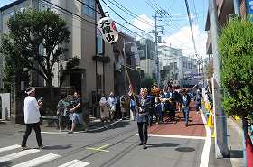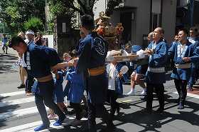 地蔵通り商店街を、おみごしが通っています。子どもたちもかついでいます。このお祭りは3年生が地域教材として学びます。