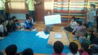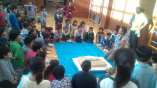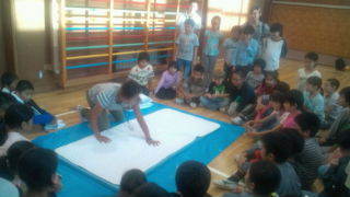 学園にいます。体育館でシーツの使い方を教えていただいています。16:45