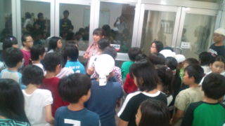 学園にいます。海岸にナイトウォークに出かけるために玄関に集まっています。19:25
