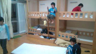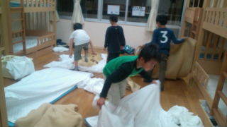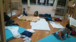 学園にいます。お風呂から上がった子どもたちは荷物整理や寝具の準備をしています。17:45