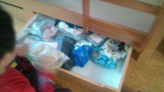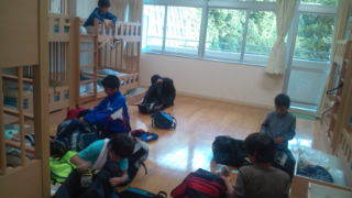 学園にいます。お風呂から上がった子どもたちは荷物整理や寝具の準備をしています。17:45