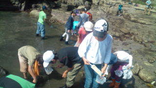 毛戸浦海岸にいます。子どもたちは磯観察をしています。9:45