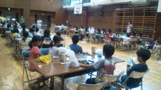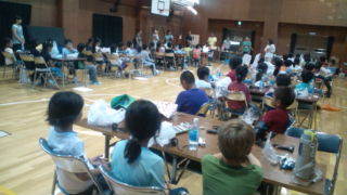 学園にいます。体育館でネイチヤークラフトが始まりました。まず、説明を聞いています。15:00