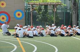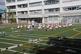 ハードル走の練習をします。まず、準備運動とめあての確認をしています。