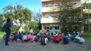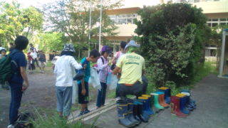 学園にいます。海岸での活動に向かいます。その前に磯観察で使う長靴や網などを借りています。8:15