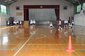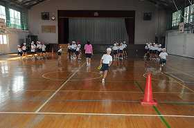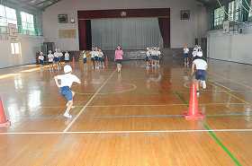 リングやボールを使い、折り返しリレーをしています。